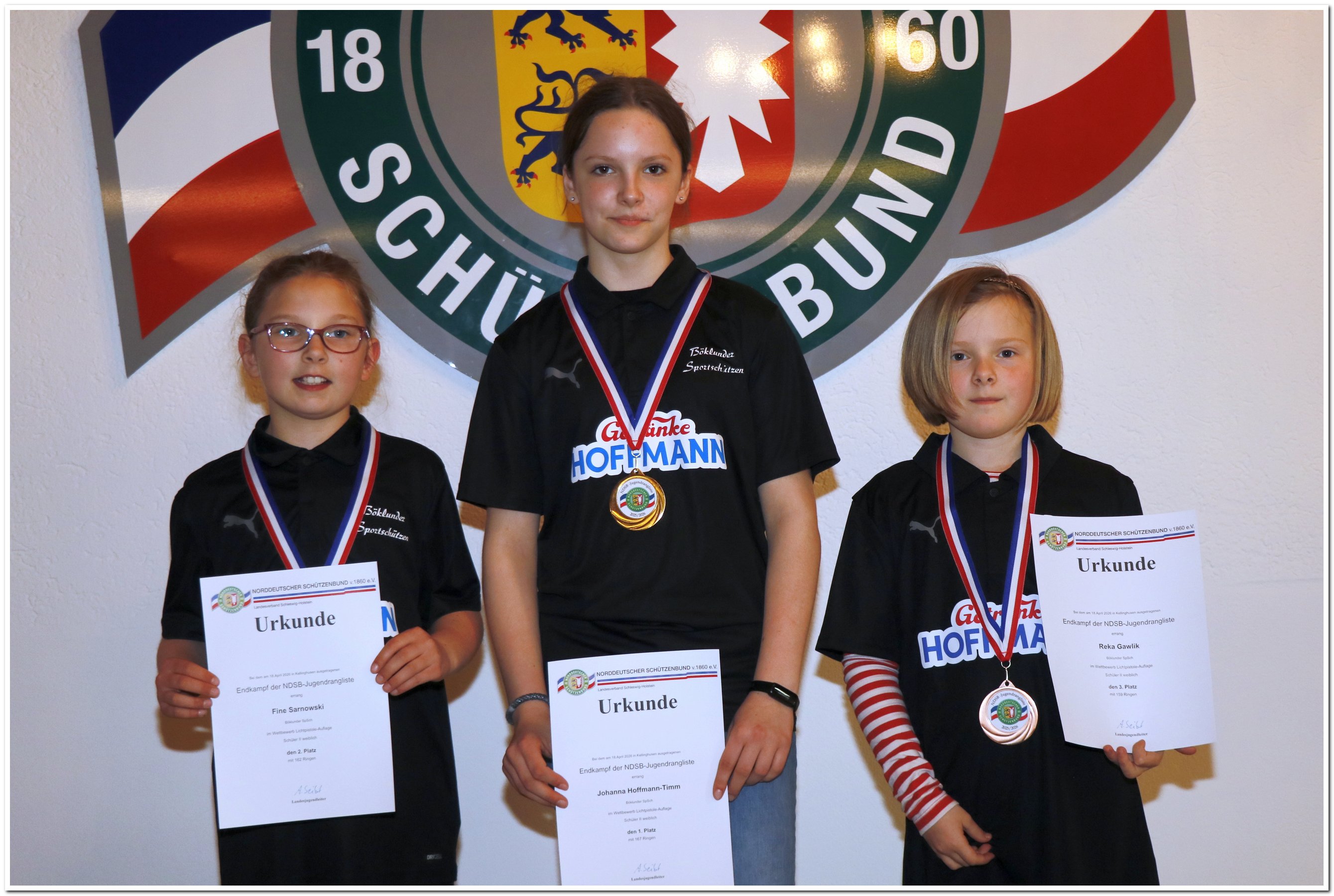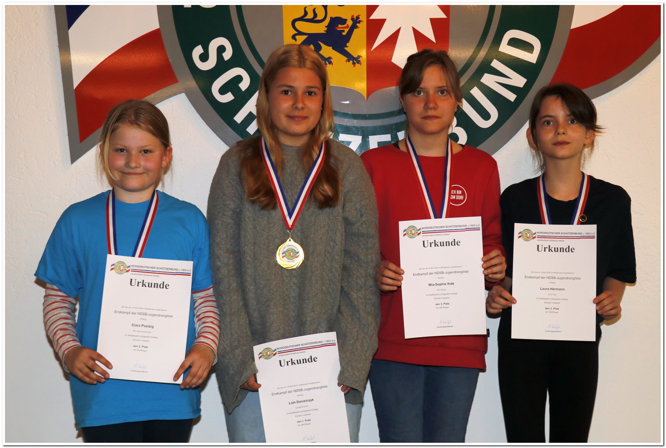 Wenn das auftritt, entscheidet die letzte Serie. Und da setzte sich Clara Poelzig vom SSV Kummerfeld auf den zweiten Platz (88/92 Ringe). Da Laura Hermann (SchV Tarp) und Mia-Sophie Ihde (SSV Kassau) sowohl bei der letzten als auch bei der vorletzten Serie gleichauf lagen, ehrte Landesjugendleiter Andreas Seibt beide gemeinsam mit dem dritten Rang. Veronica Santangelo (SchV Tarp) wurde mit ebenfalls 180 Ringen Fünfte.