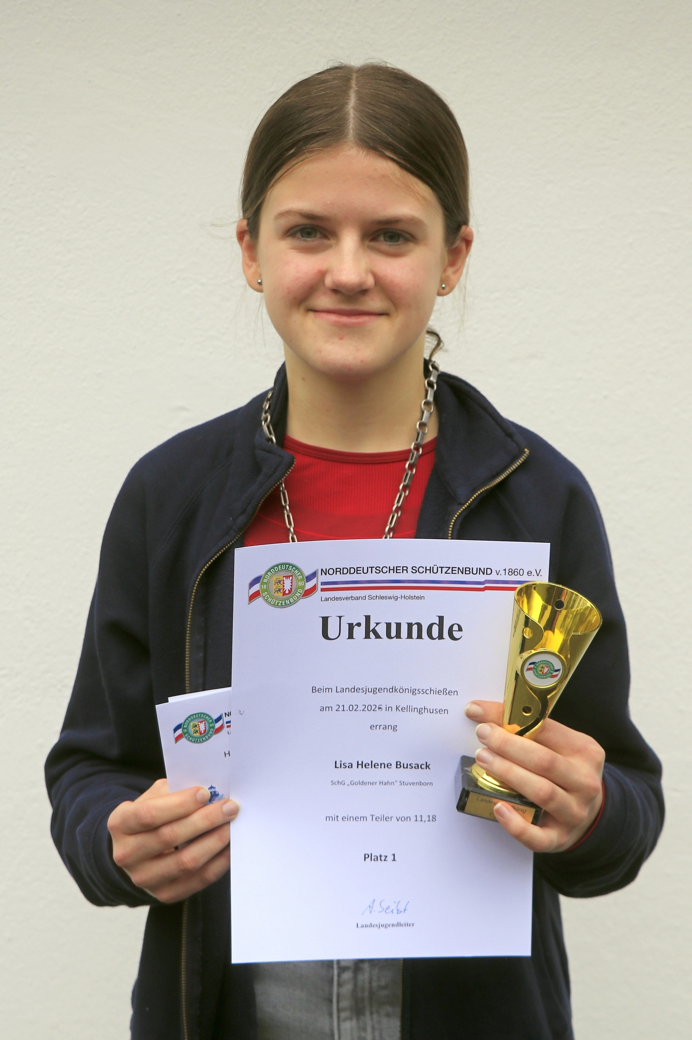 Helene Busack fand im Jahr 2022 den Weg durch das Kindervogelschießen in ihrem Heimatort Kisdorferwohld zum Schießsport. Durch intensives Training und großen Ehrgeiz entwickelte sie sich schnell zur Leistungsträgerin. Ende 2022, nach dem offenen Training, wurde sie in den Landesjugendkader berufen.